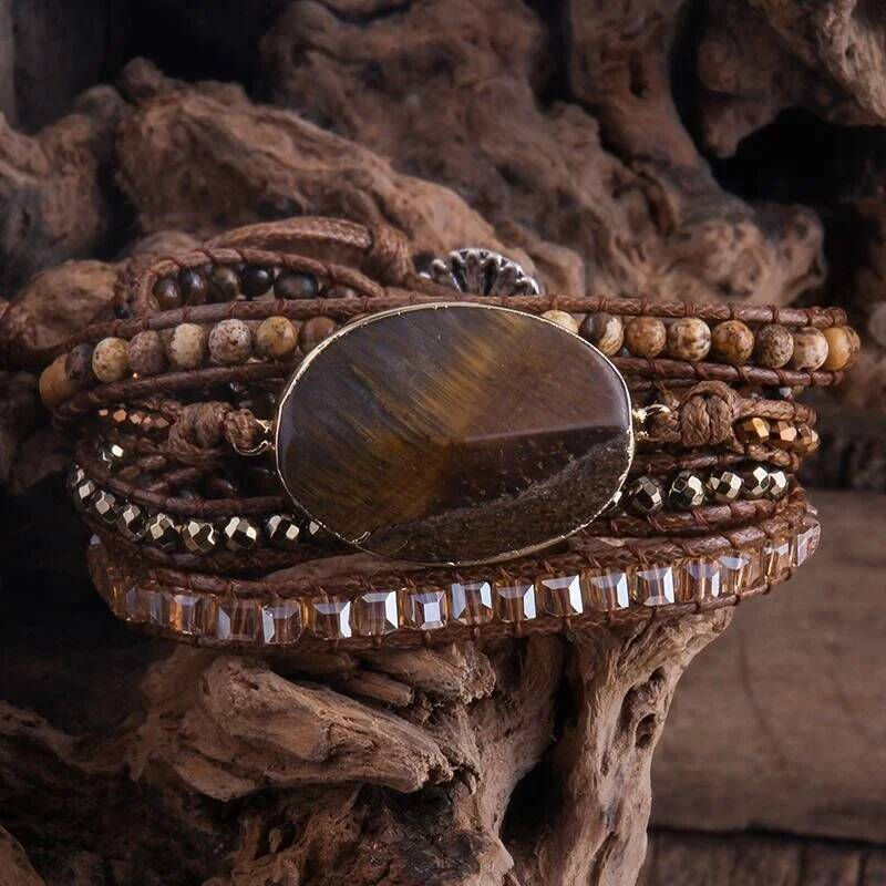 Boho Wickelarmband in Tigerauge/ braun mit Glas und Edelsteinperlen